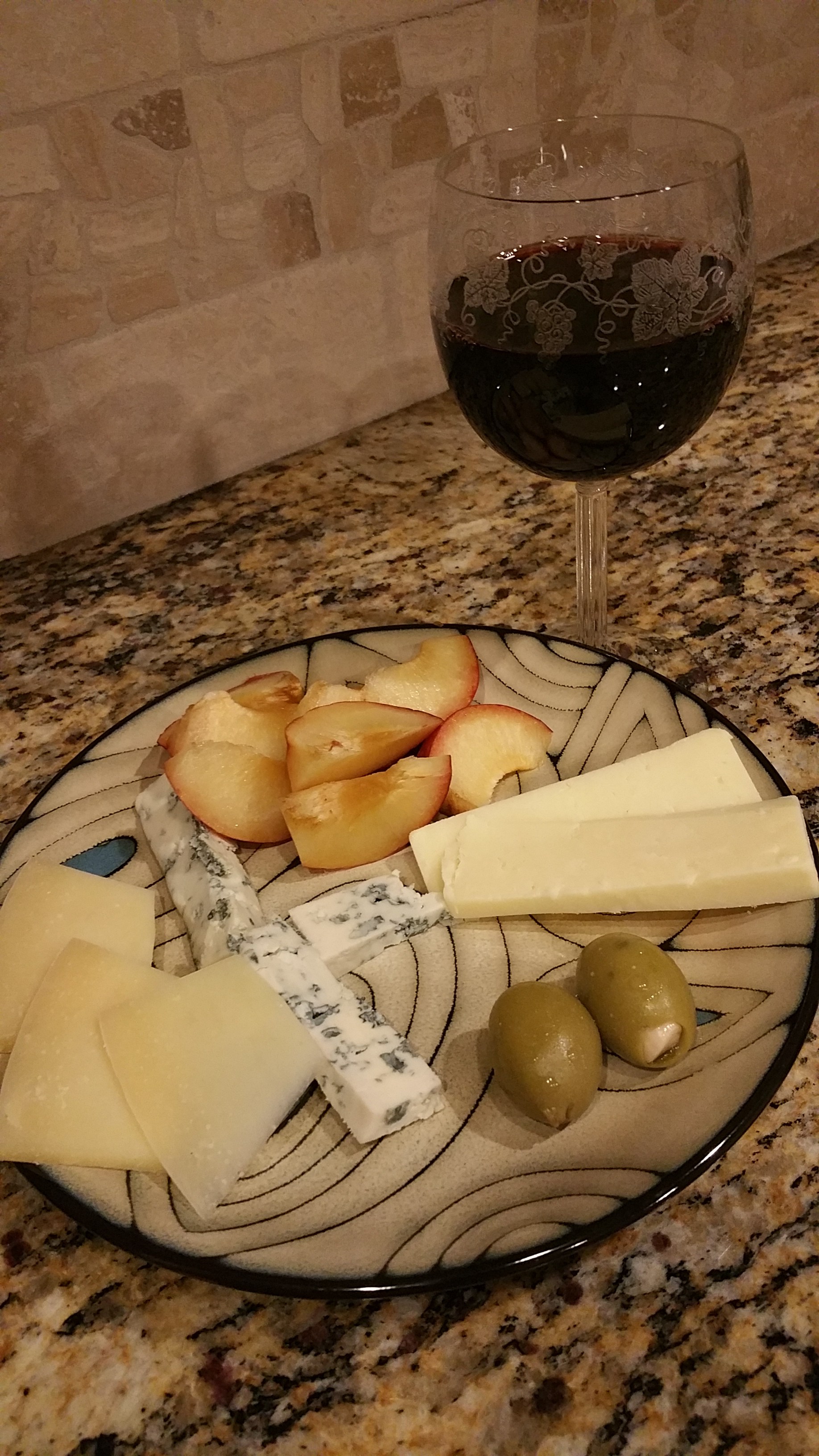 After a long, strange day and evening, tonight just seemed to call for wine and cheese. It would be a relaxer, a way to slip into the evening rather than be thrust into it with no adjusting timeline. So I made it be so. Here’s bleu cheese, parmesan, and white cheddar accompanying a sliced plum and a nice fat olive. With a glass of cabernet sauvignon. I enjoyed it. And I enjoyed the occasional calls that had no voice on the other end of the line. I did not enjoy the sound, tonight, of acorns raining down on the deck in rapid-fire fashion. Before we left for our engagement late this afternoon, I used the lawn blower to remove all the leaves and acorns from the deck. A short while ago, the rain of acorns was incredibly loud. I suspect my work was for naught. Notwithstanding the acorns, I do love the forests here.